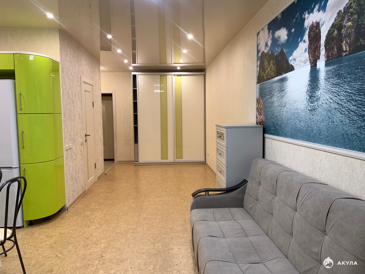 Мебель: кухонный гарнитур, двуспальный диван, вместительный шкаф-купе.