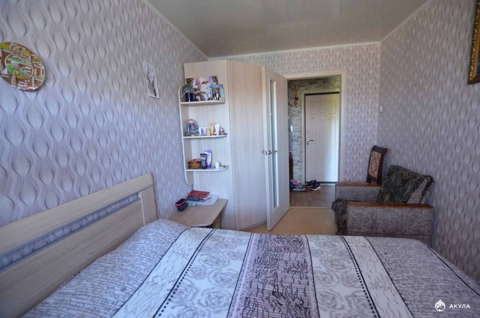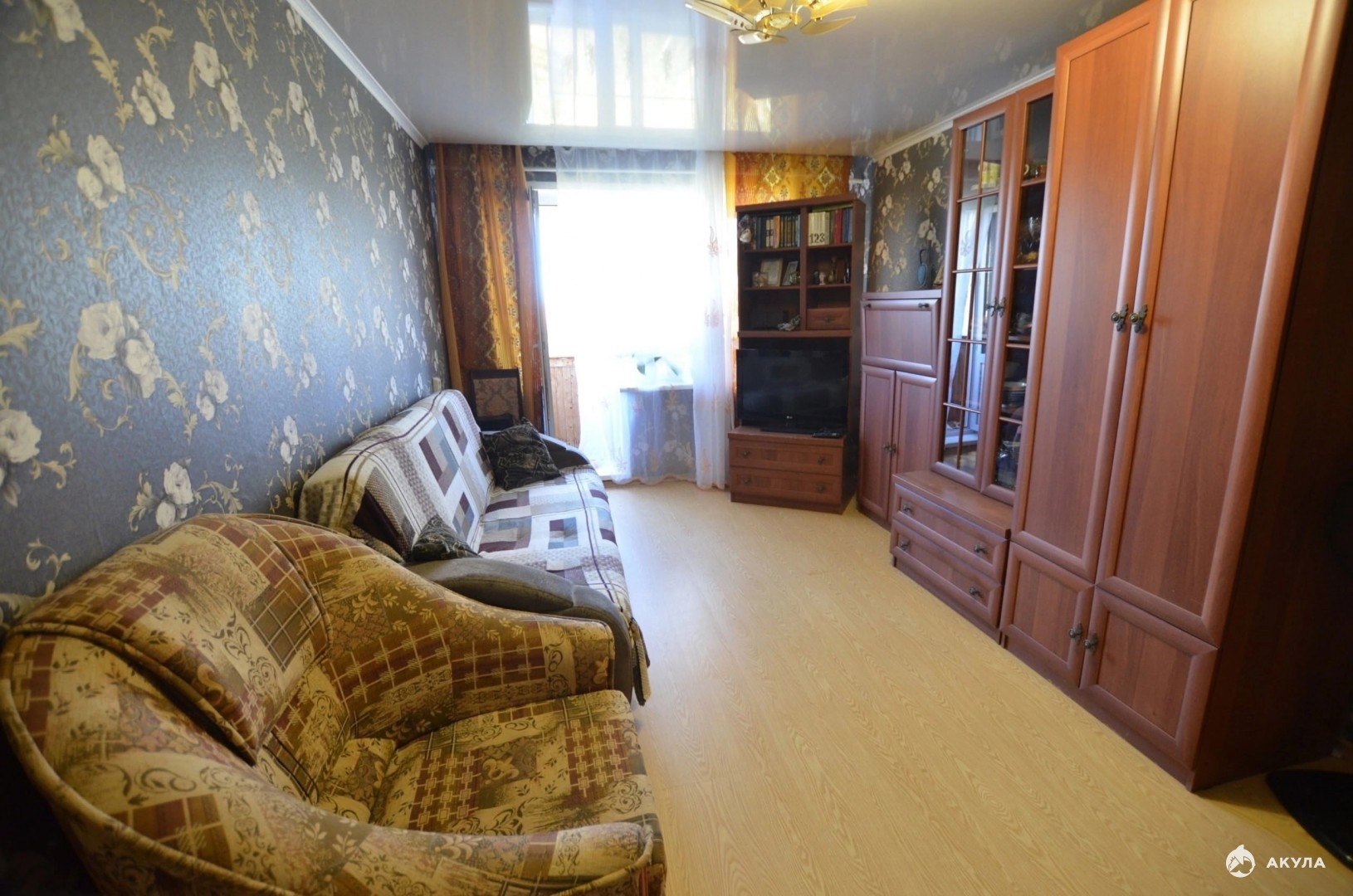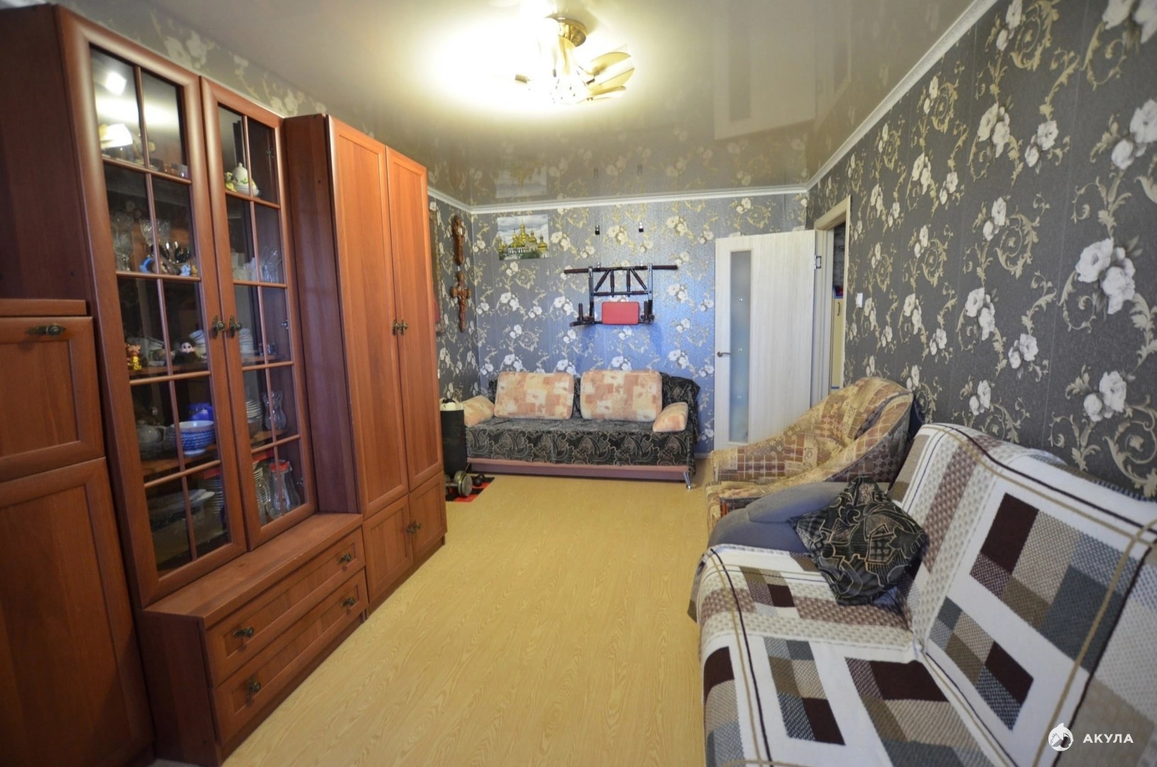 Остаётся кухонный гарнитур, встроенный шкаф в коридоре, в спальне кровать, в зале стенка и один диван.